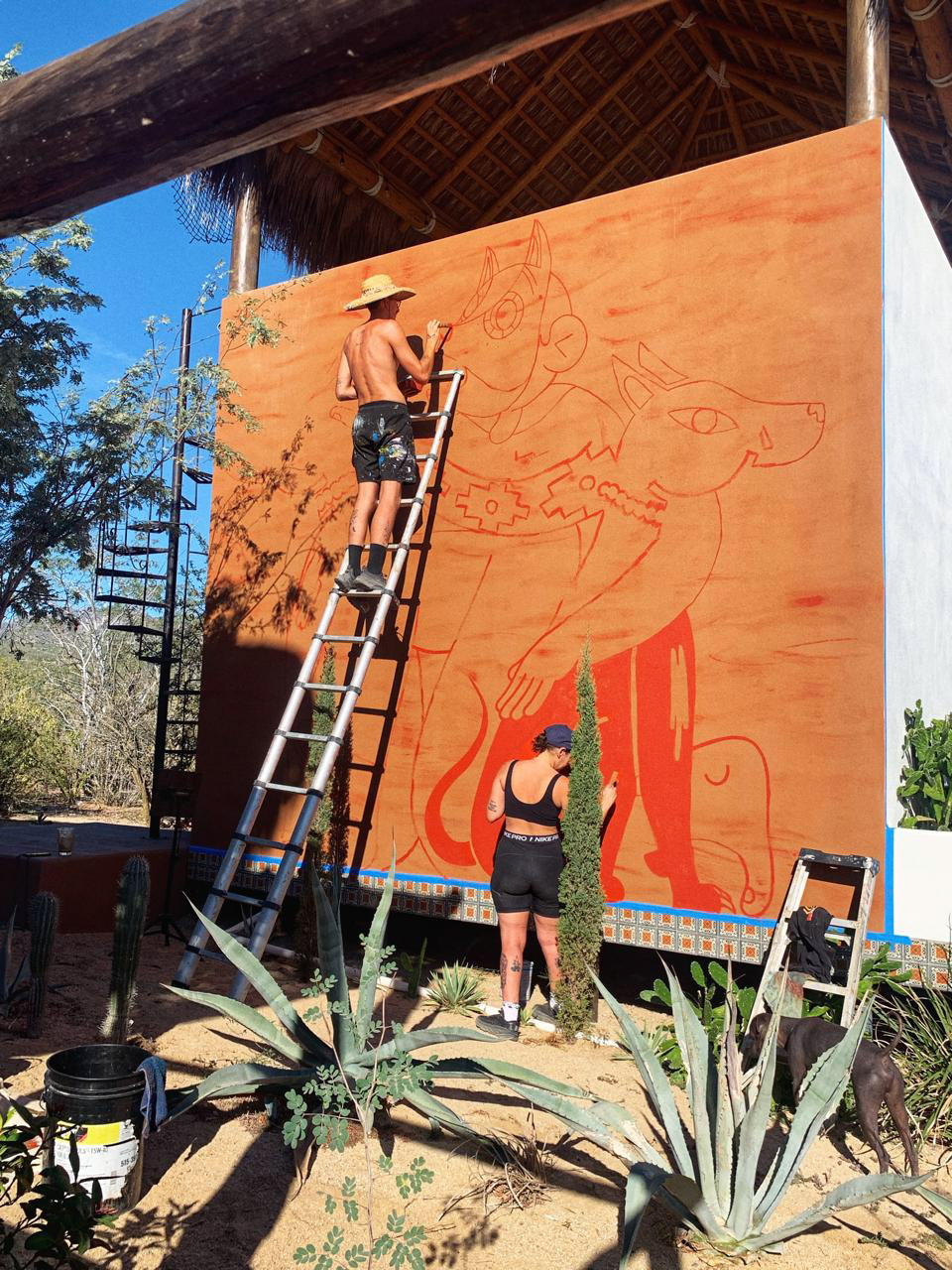 Le restaurant gastronomique le plus populaire de La Ventana souhaitait réaliser une murale discrète, représentant les valeurs de leur espace et mettant en scène leurs deux adorables chiens Mitclan et Tlaloc.