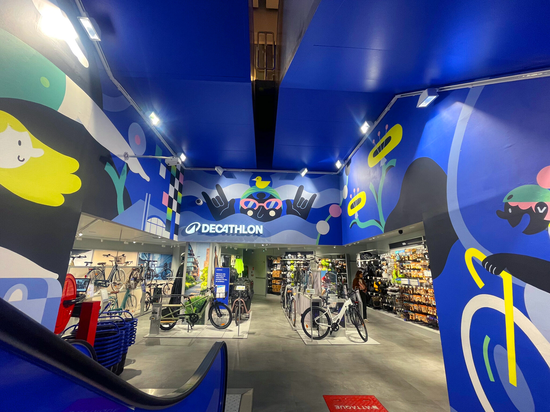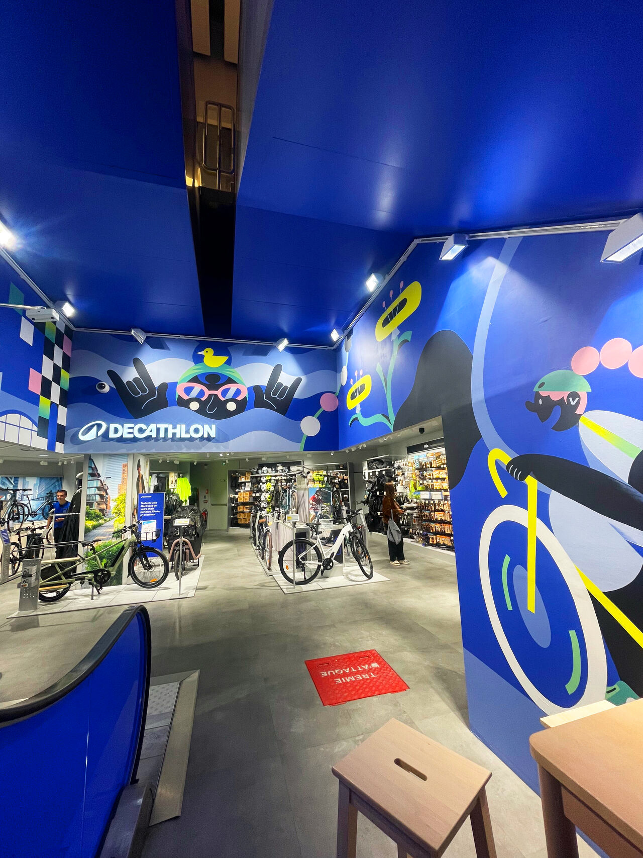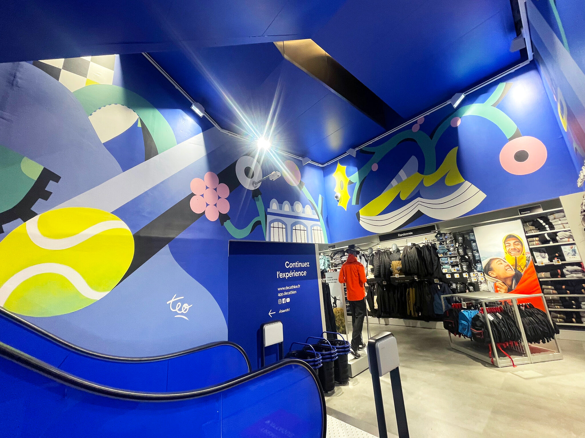 J’ai alors imaginé et réalisé une fresque murale à 360°, recouvrant les escalators d’entrée et de sortie, ainsi que les murs des cabines d’essayage et des caisses. Des illustrations pop et vibrantes, pensées pour inspirer et motiver chaque visiteur à retrouver le plaisir du sport à travers la créativité et la bonne humeur.