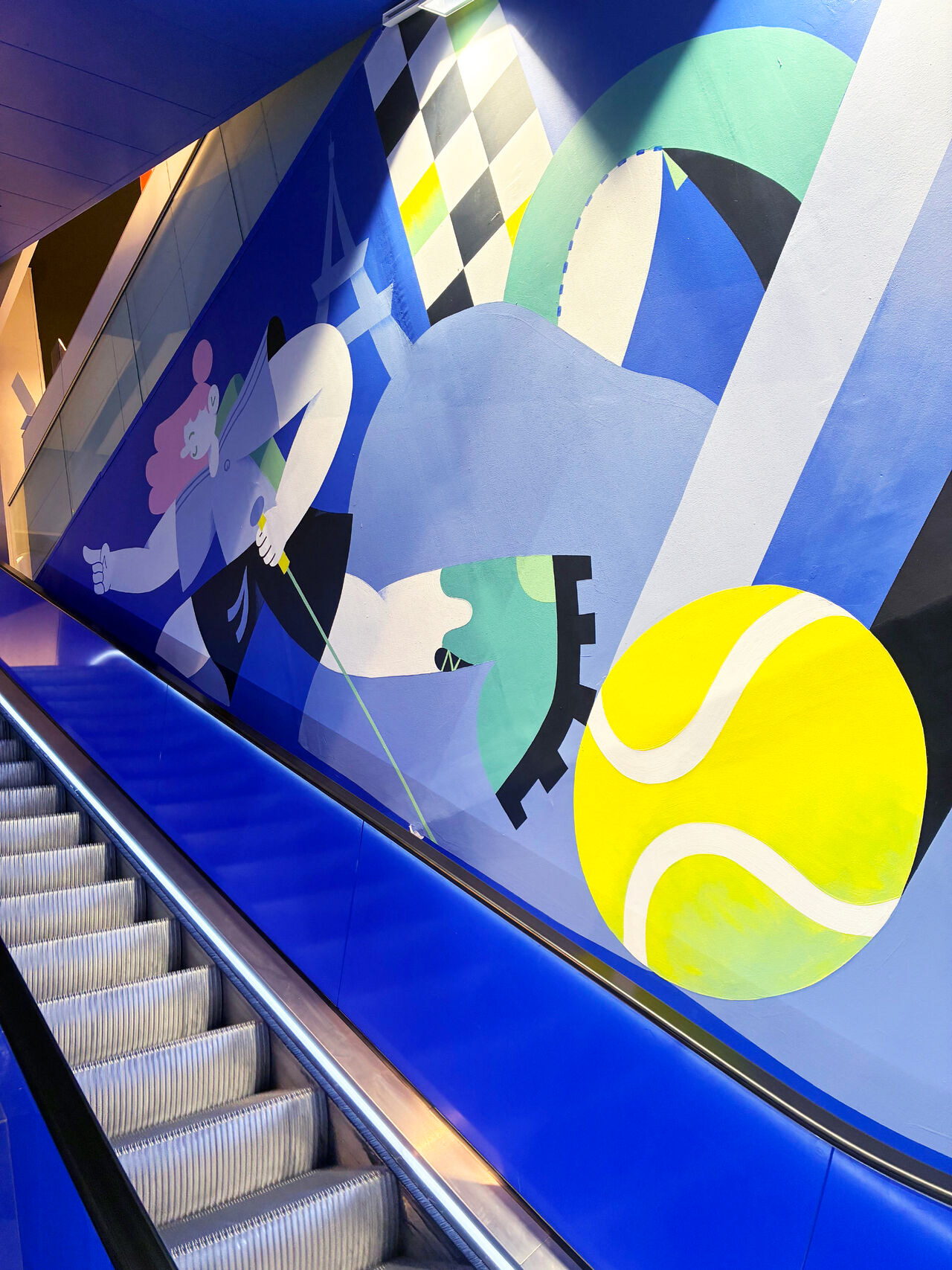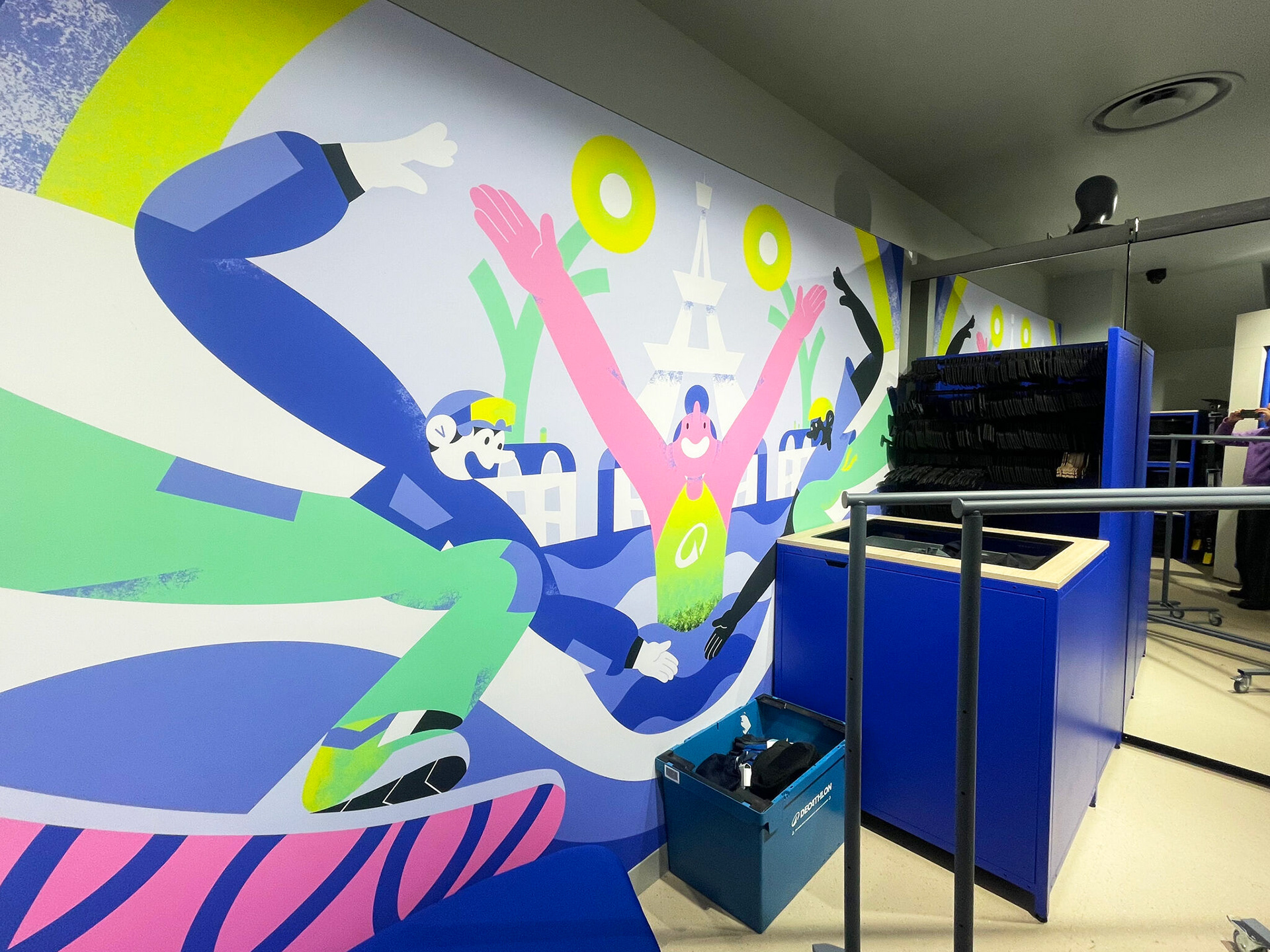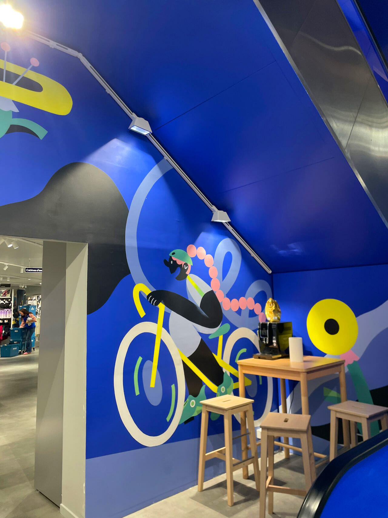 J’ai alors imaginé et réalisé une fresque murale à 360°, recouvrant les escalators d’entrée et de sortie, ainsi que les murs des cabines d’essayage et des caisses. Des illustrations pop et vibrantes, pensées pour inspirer et motiver chaque visiteur à retrouver le plaisir du sport à travers la créativité et la bonne humeur.