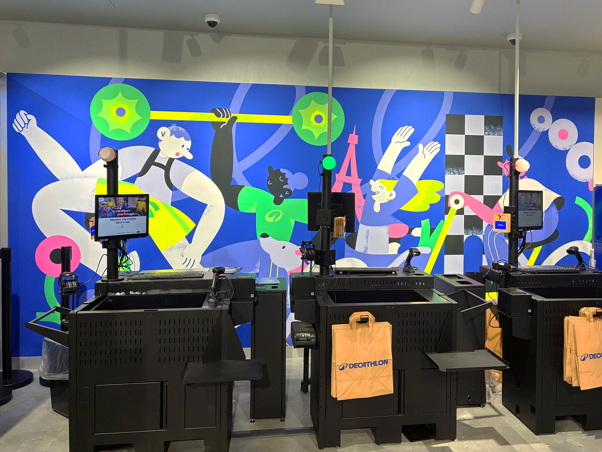 En plus d’avoir peint l’ensemble des murs d’entrée et de sortie, Decathlon m’a confié la création d’illustrations pour les cabines d’essayage et les caisses.