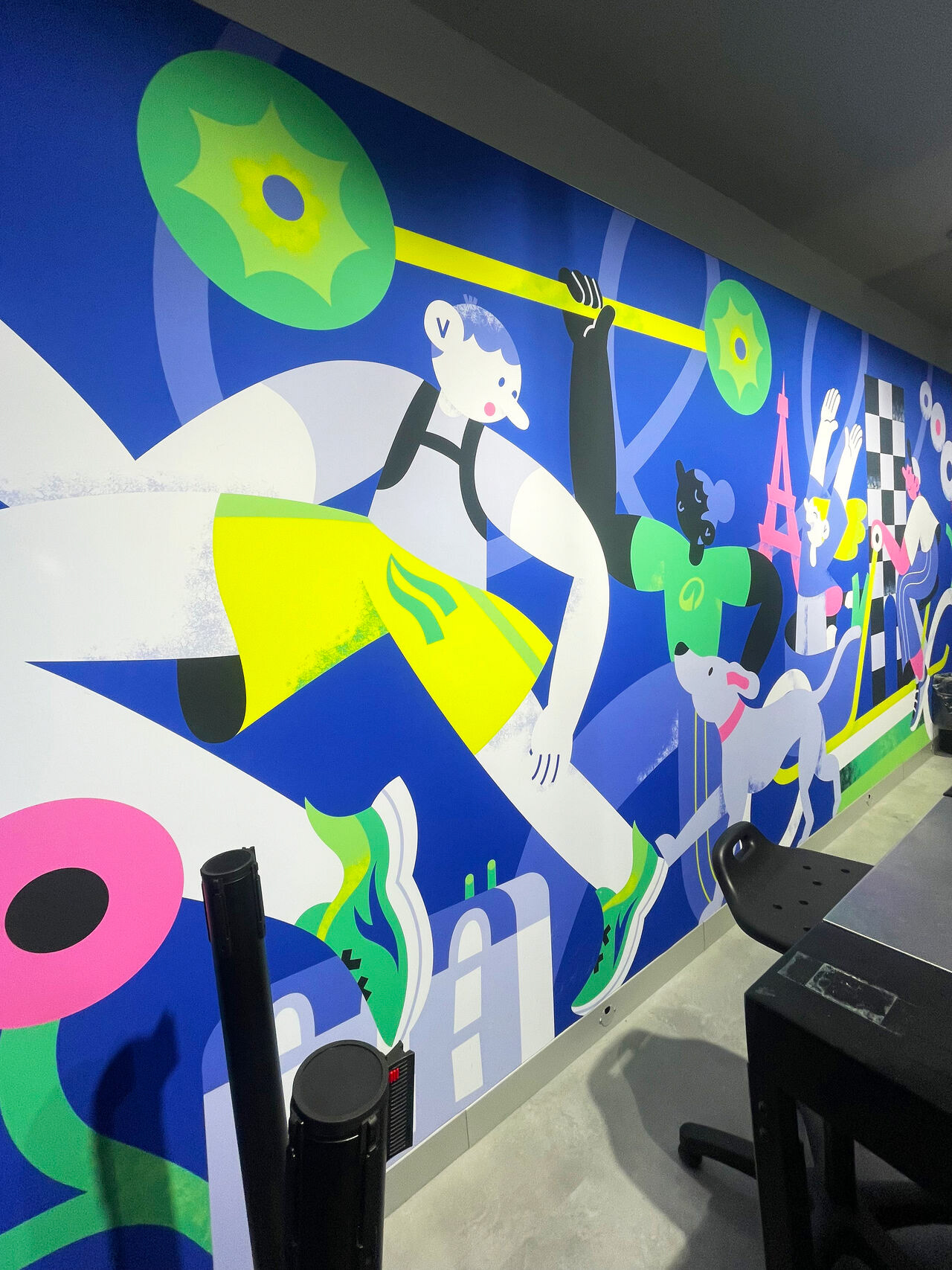 À l’occasion de l’ouverture de leur nouveau magasin Decathlon City dans le quartier Montparnasse à Paris, la marque m’a confié une mission unique : transformer leurs murs en un univers coloré et accueillant, afin de créer une atmosphère à la fois bienveillante et dynamique.