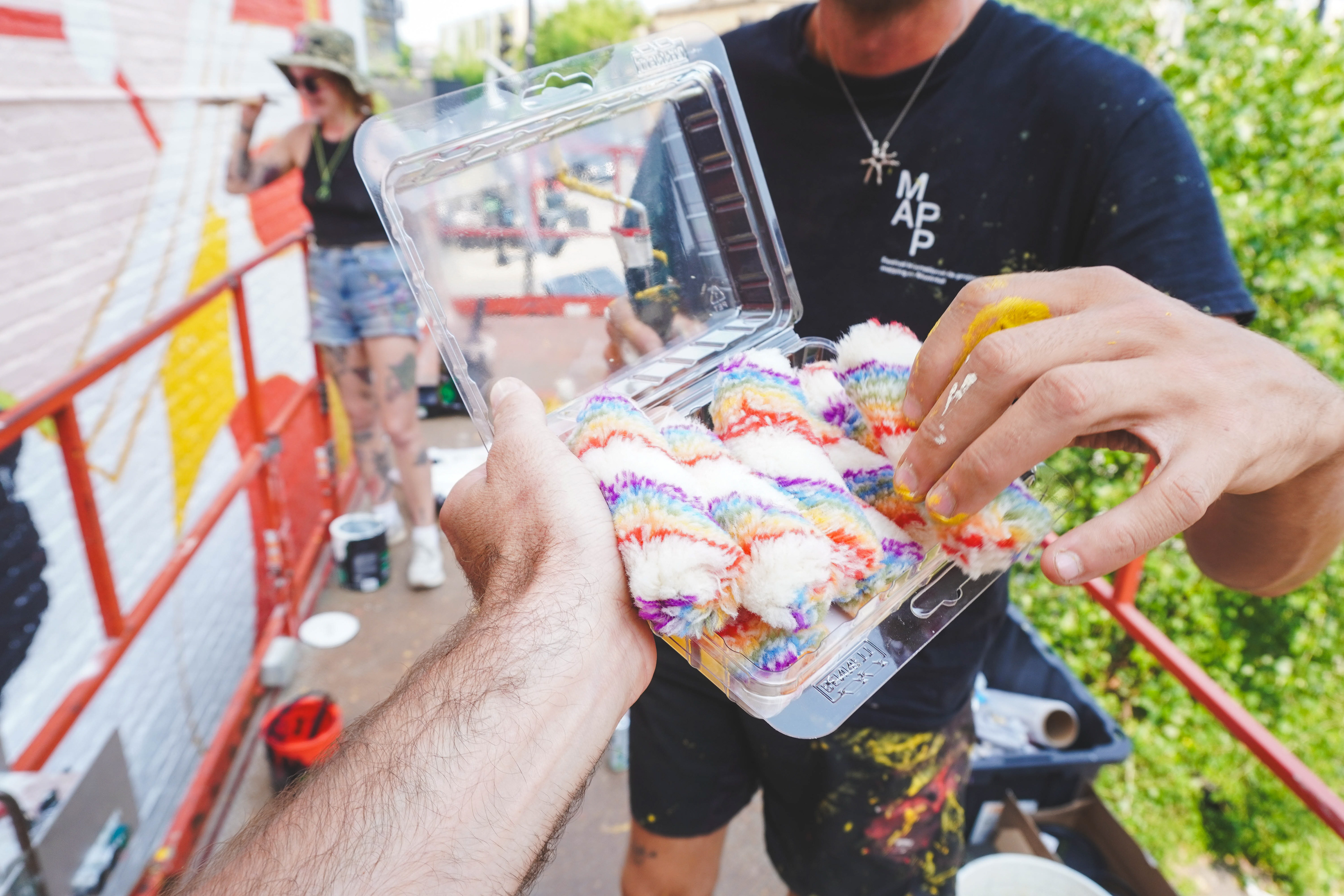 Pendant 9 jours intenses, entre soleil éclatant et averses inattendues, j’ai eu la chance de peindre aux côtés de mes deux assistants talentueux, Nikki Kuentzel et Phil. Ensemble, nous avons donné vie à Le son des tams-tams, une œuvre vibrante de plus de 280 m².