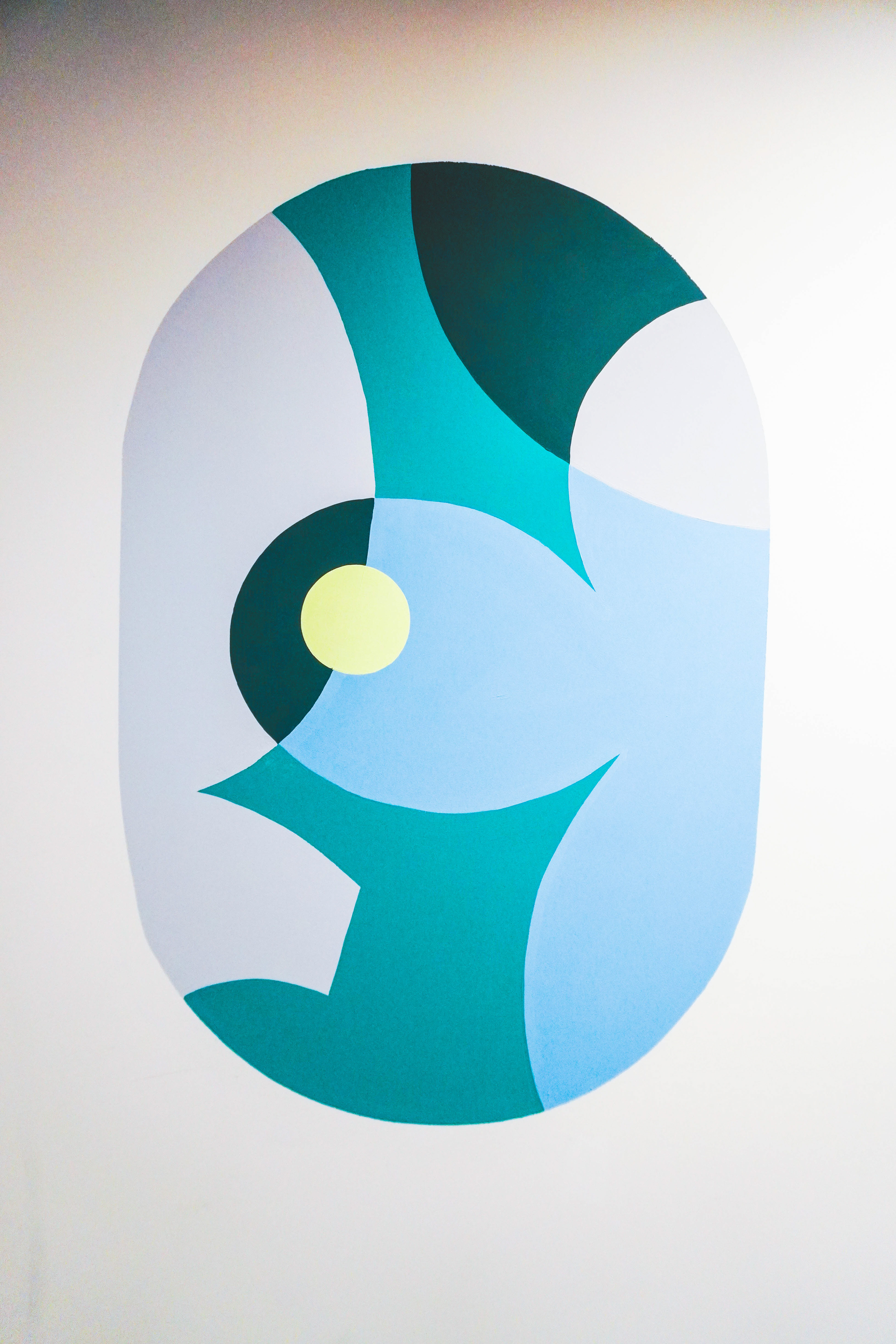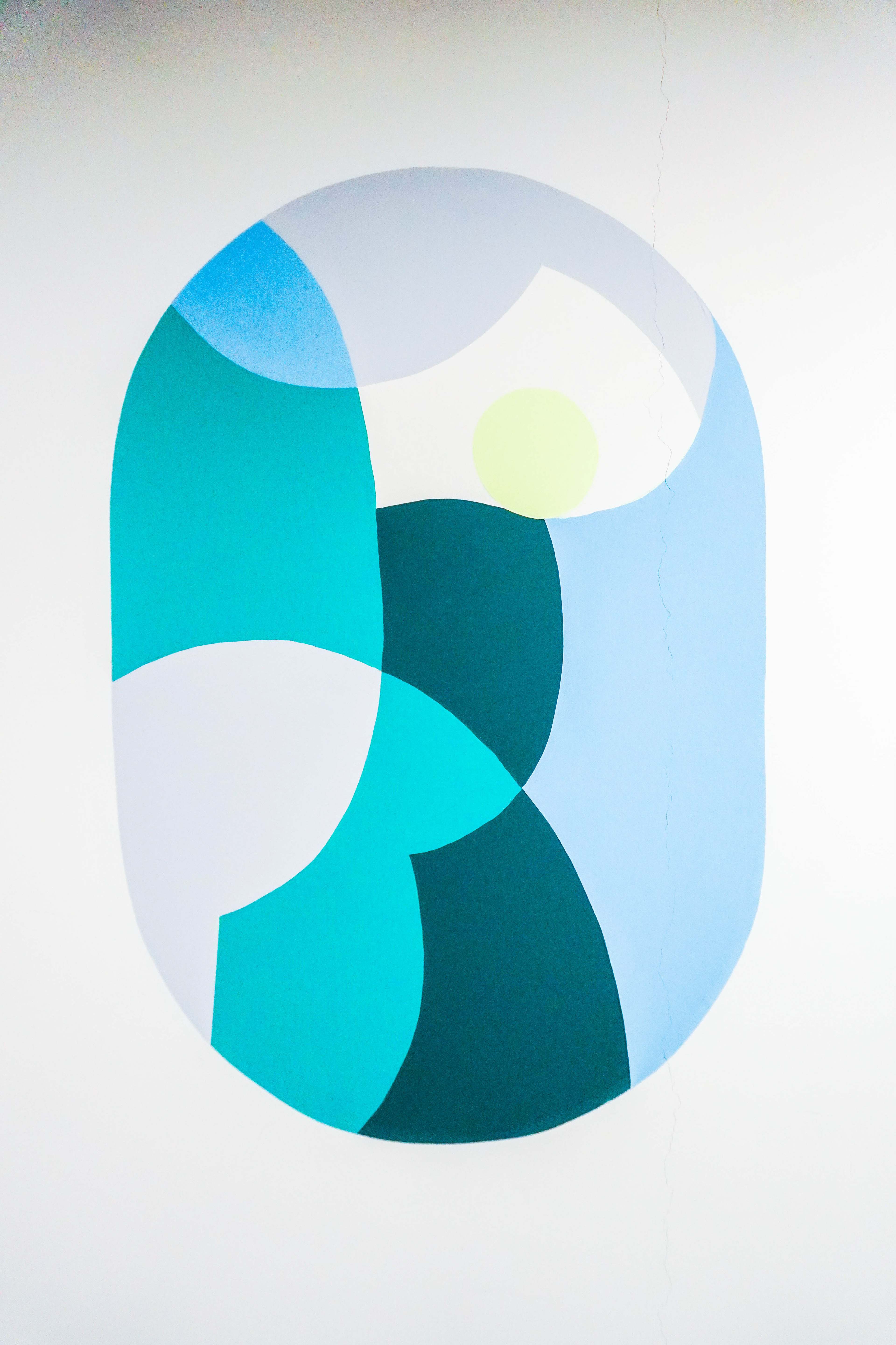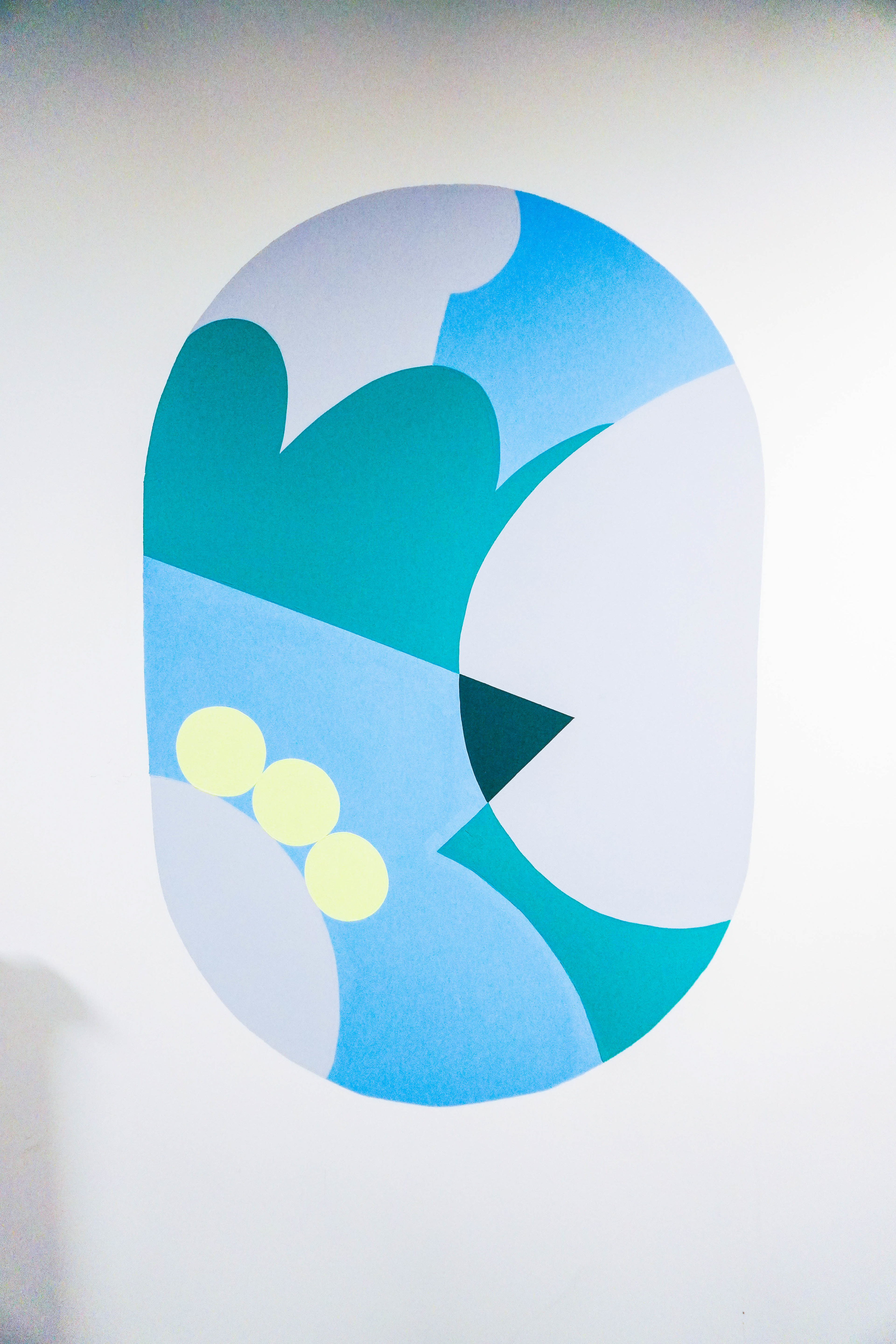 En plus d’avoir recouvert l’un des murs dans son intégralité, j’ai créé quelques rappels graphiques sur le mur opposé. Ces formes agissent comme de véritables hublots, ouvrant une fenêtre vers un paysage abstrait situé hors champ.