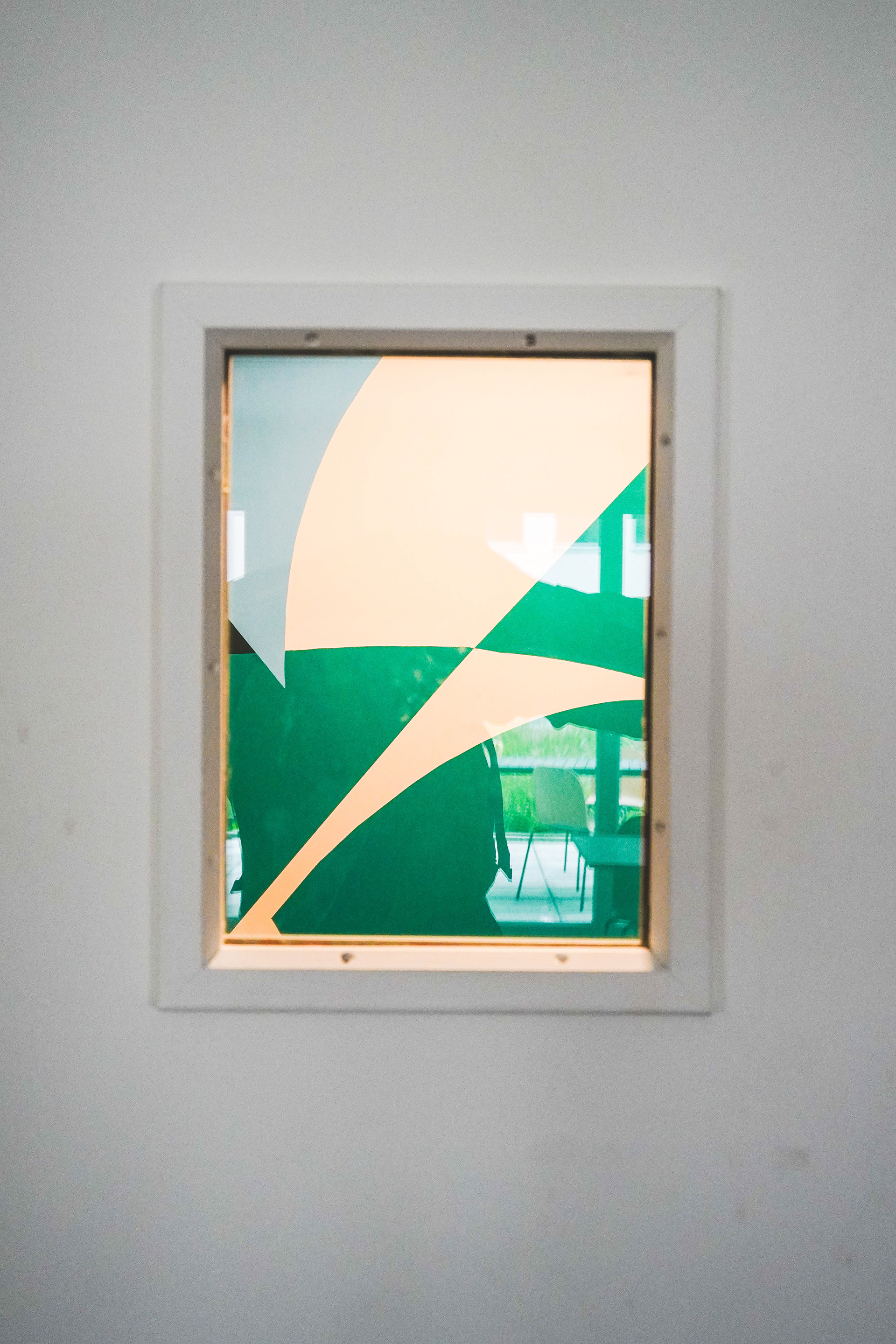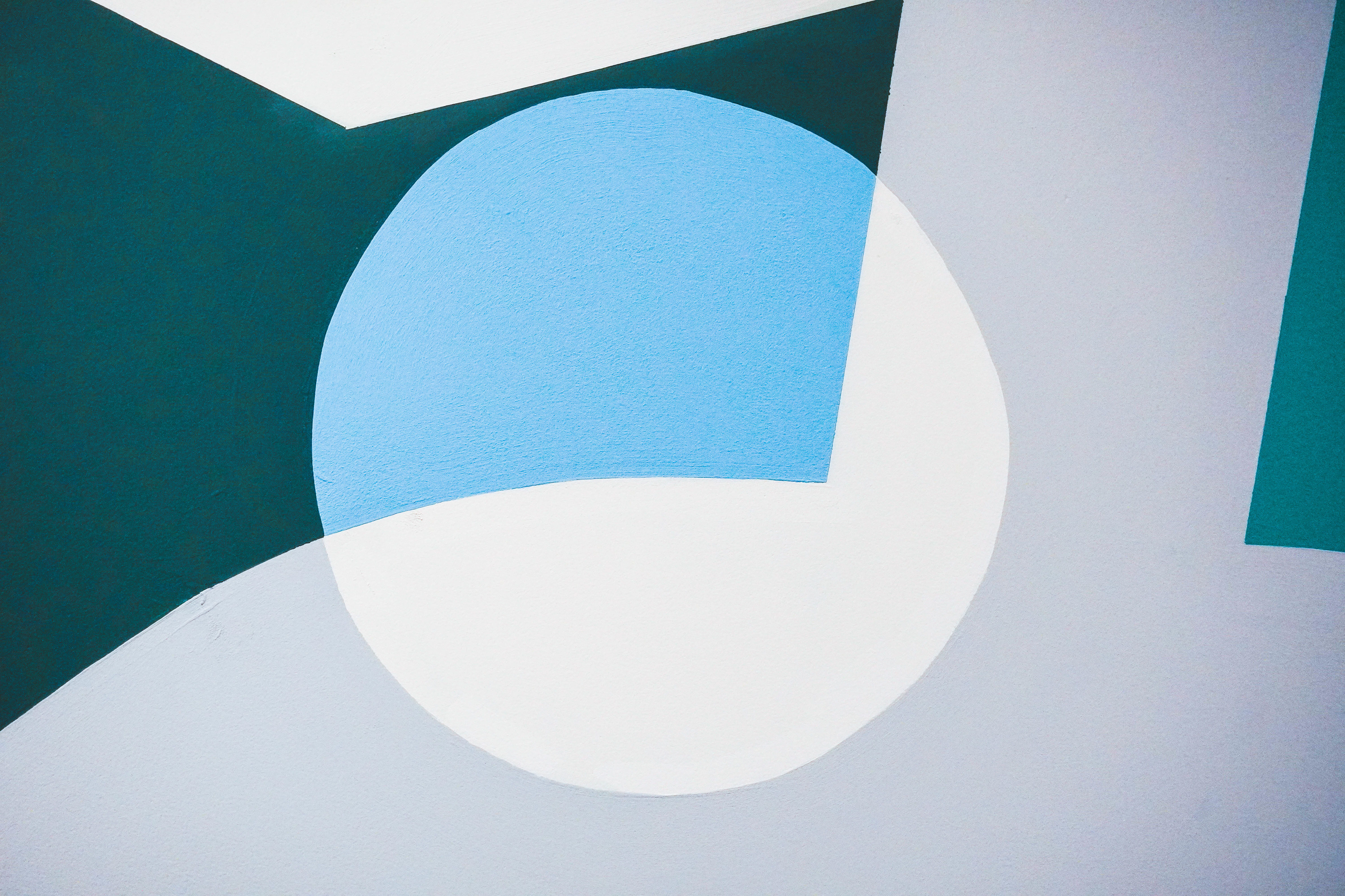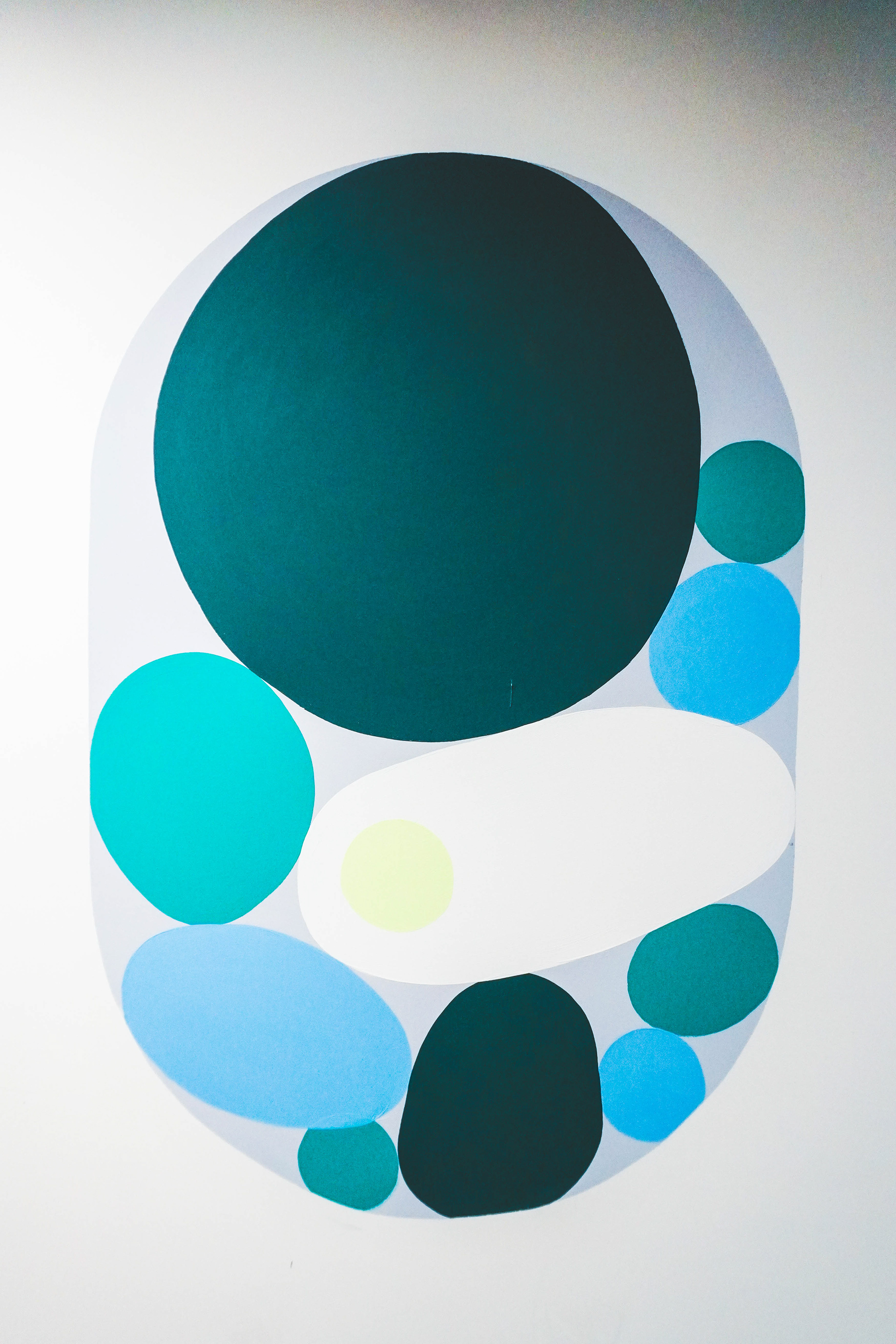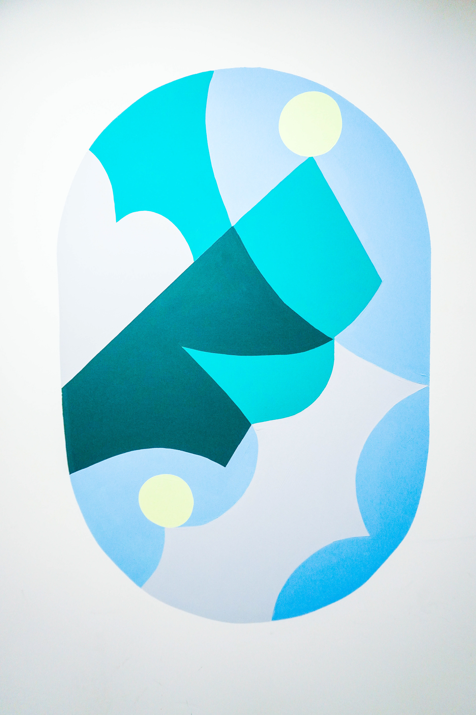 En plus d’avoir recouvert l’un des murs dans son intégralité, j’ai créé quelques rappels graphiques sur le mur opposé. Ces formes agissent comme de véritables hublots, ouvrant une fenêtre vers un paysage abstrait situé hors champ.